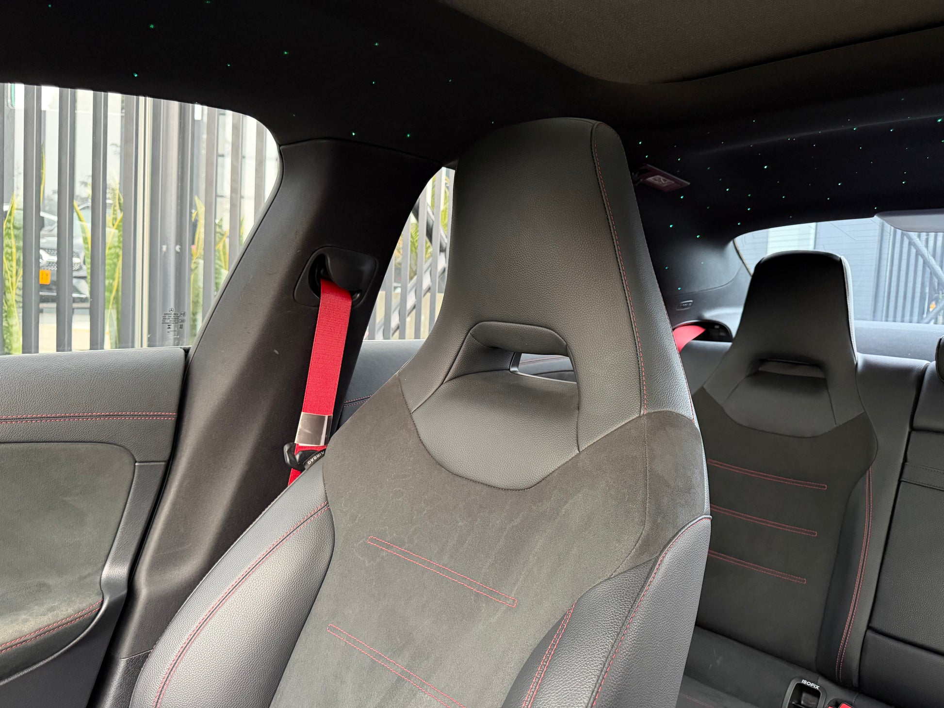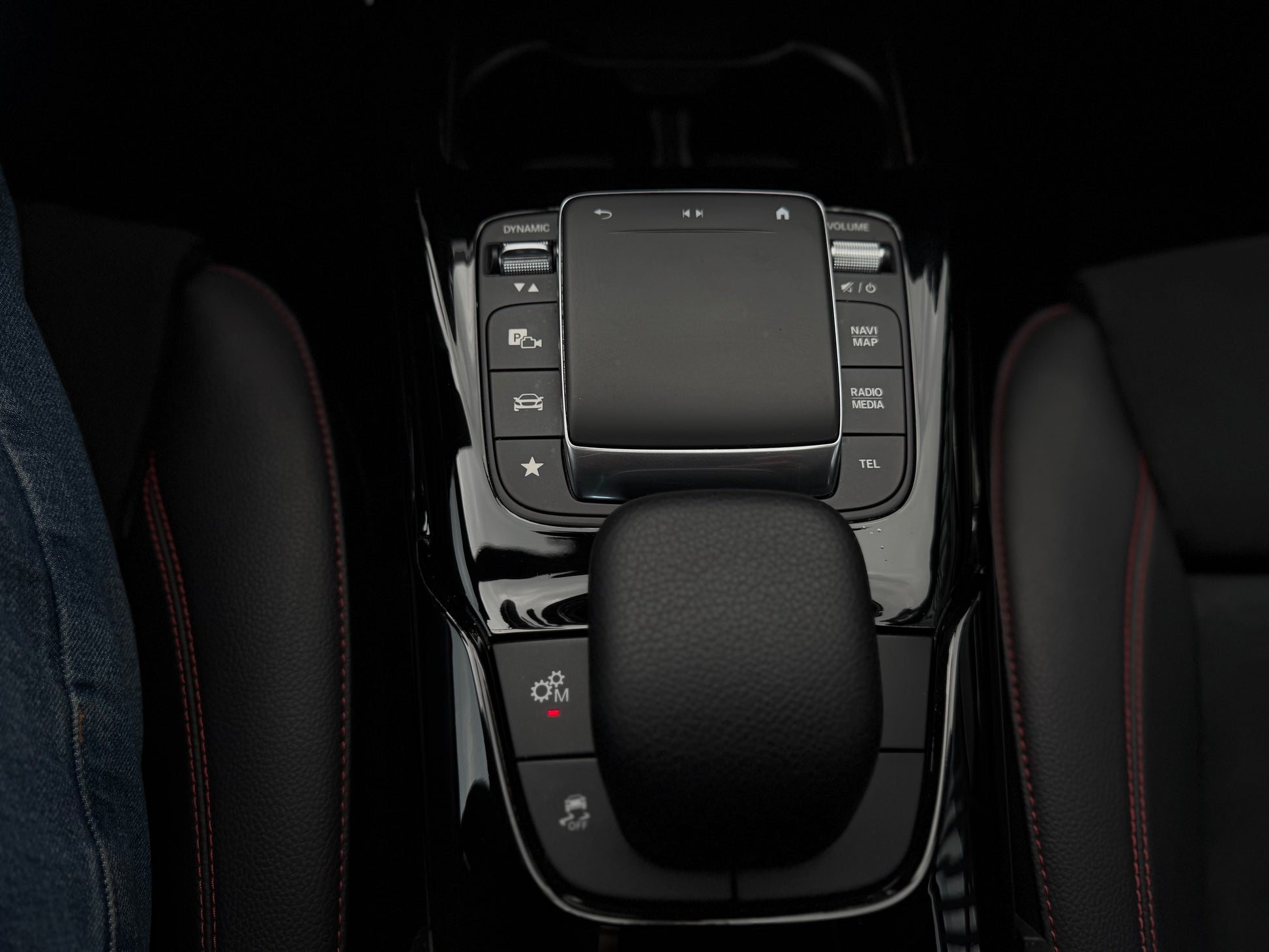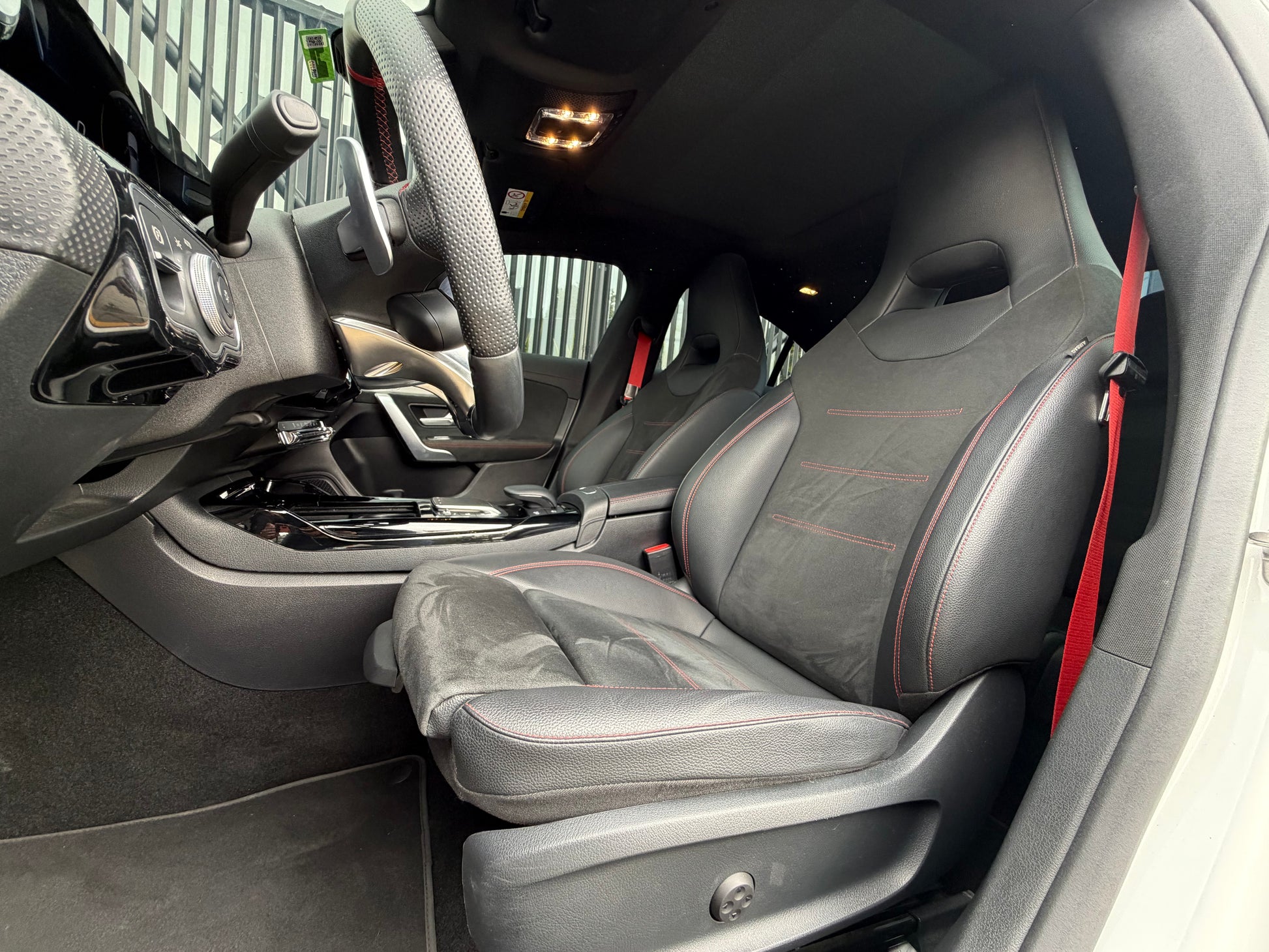 Tiene un volante deportivo multifunción en cuero con costuras rojas y levas de cambio